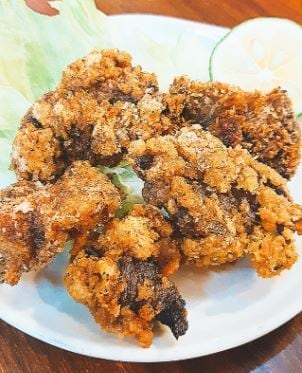 厳選した鯨赤身の刺身に、高知県産の生姜たっぷりすりおろした生姜醤油に浸け、卵もたっぷり浸け、揚げました。